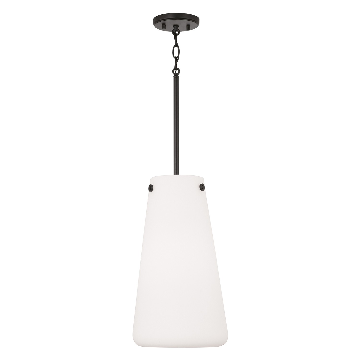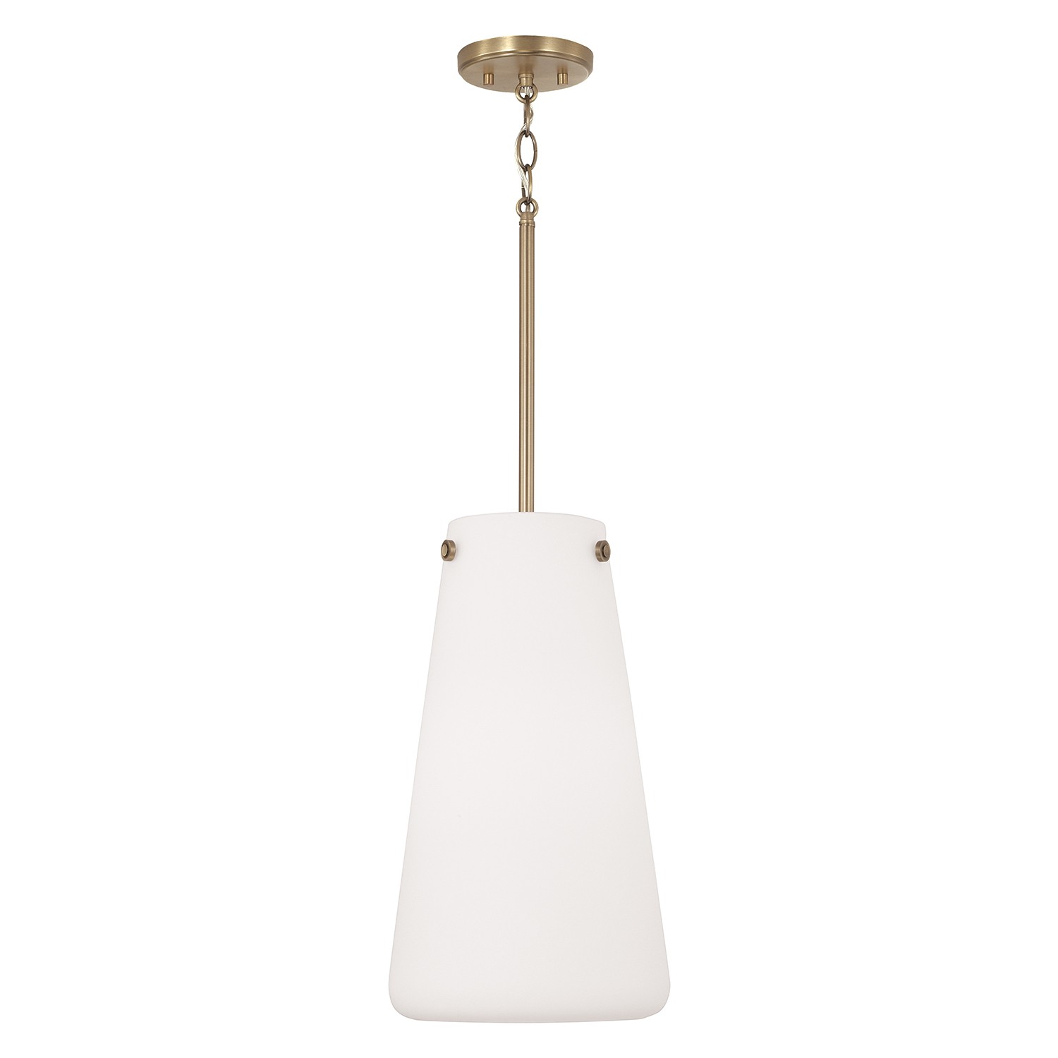 The Averitt Pendant delivers elegant transitional style with grand scale. The exposed rivet details and unique rounded, recessed bottom add high design to the elongated Soft White glass tapered shade, while the Aged Brass finish creates subtle shine and sophistication.
