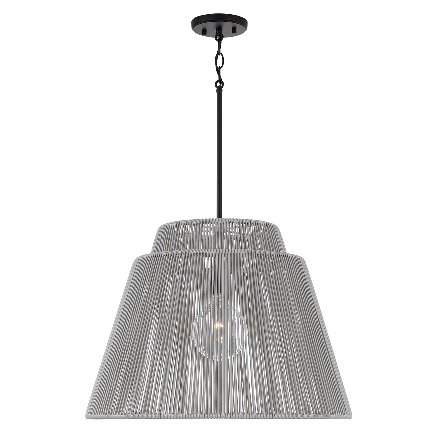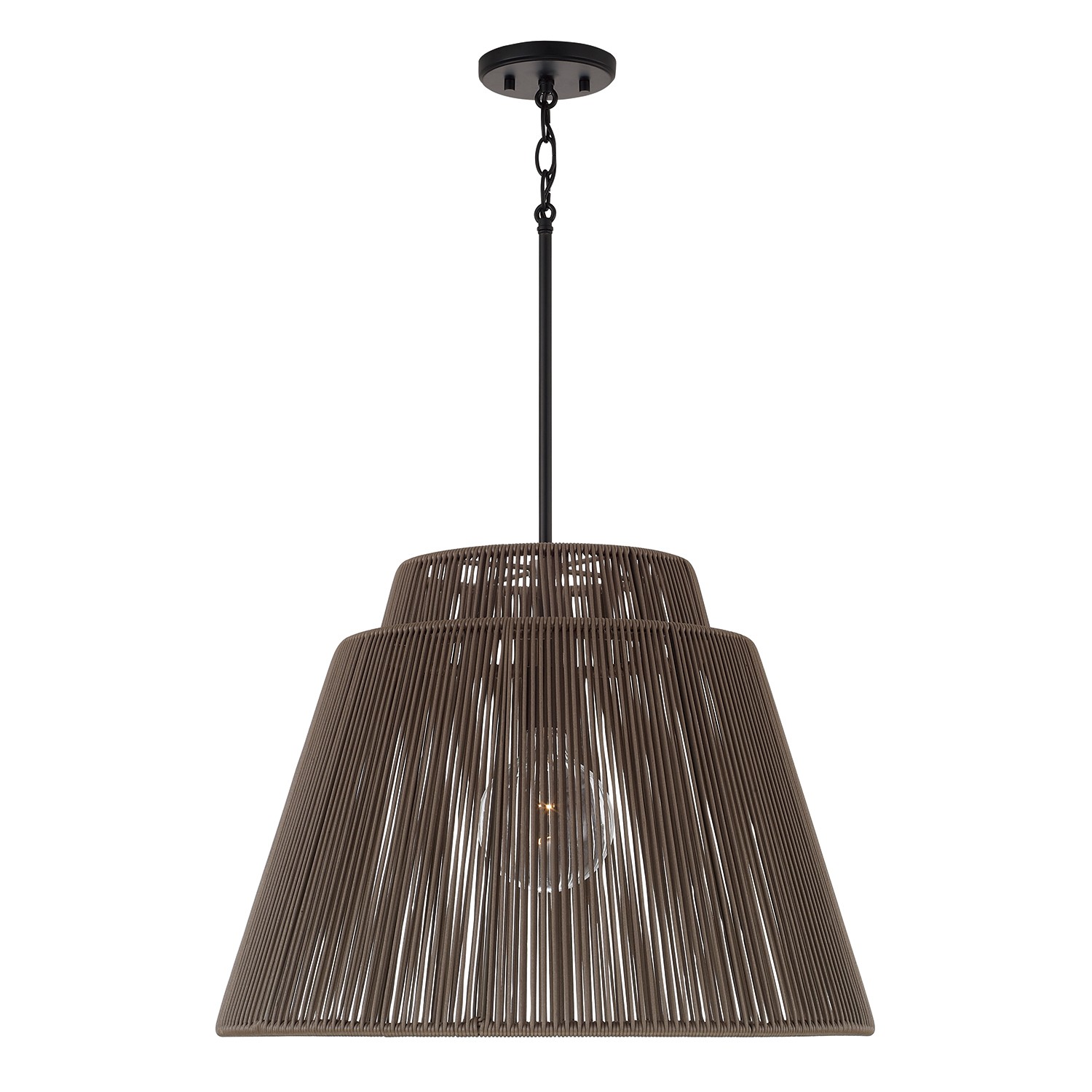 Purposefully crafted for interior and exterior spaces, the Jasper Indoor/Outdoor Pendant seamlessly blends durable design with high style. The weather-resistant hand-wrapped resin delivers a familiar aesthetic in the warm Sienna brown, while the Matte Black finish gives a nod to modern style. Rated for Damp Locations and backed by our one-year warranty.