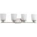 A modern form with industrial-inspired accents are featured in West Village. Double prismatic glass shades provide a beautiful illumination effect. Visual interest continues with a three-spoke design that holds each glass shade. Brushed Nickel with chrome accents provide touches of mixed metal. The four-light bath fixture can be installed with glass facing up or down. This fixture is part of our Design Series collections.