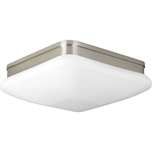 With an elevated style, the two-light 11 inch flush mount appeals to current home decor trends. Soft contemporary design includes square etched opal glass. Damp location listed. Brushed Nickel finish.