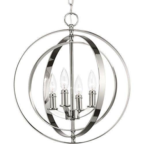 Inspired by ancient astronomy armillary spheres. This oversized oval fixture is part of the stunning Equinox collection. Interlocking rings pivot for an infinite variety of positions. Four-light foyer pendant in a Polished Nickel finish is ideal for linear installations over a farmhouse table, dining room setting or kitchen island.
