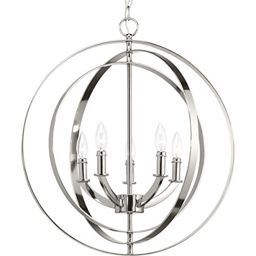 Inspired by ancient astronomy armillary spheres, the interlocking rings pivot for an infinite variety of positions. Five-light chandelier pendant in Polished Chrome is ideal for installations over a farmhouse table, dining room setting or kitchen island. Can be used individually or in groupings of two or more.
