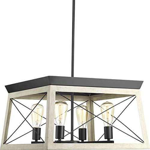 The Briarwood collection features a classic pattern commonly found on barn or farmhouse doors and gates. The simple geometric form features a faux-painted wood enclosure to frame vintage-style light bulbs. A coastal-inspired whitewashed finish paired with Graphite details. Four-Light chandelier.