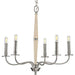 This versatile chandelier from the Durrell Collection will easily find a home in a variety of settings in need of generous illumination. Light bases reminiscent of vintage candlesticks are coated in a beautiful brushed nickel finish and appear to float around the structure on gently curving metal arms. A wooden column coated in a cerused white finish stretches elegantly at the light fixture�s center to attach the design to a linked metal chain.