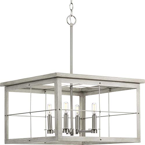 Experience the perfect blend of farmhouse character and urban sophistication with the Hedgerow Collection 4-Light Grey Washed Oak Farmhouse Chandelier Light. The softly textured, artistic faux wood frame showcasing a classic windowpane design is coated in a grey washed oak finish with beautiful brushed nickel accents that elevates the typically farmhouse aesthetic. The light sources peek through the windowpane design for an overall lighter look and feel.
