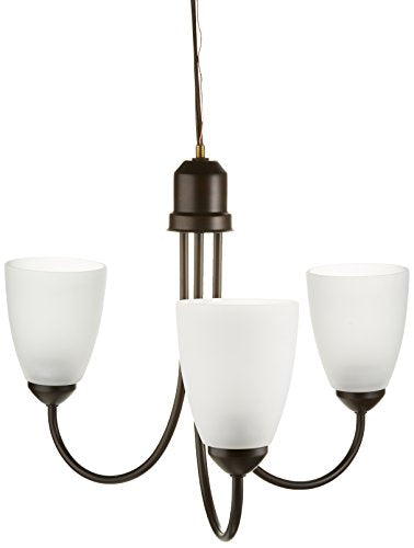 Three-light chandelier from Gather possesses a smart simplicity to complement today's home. Antique Bronze metal arms descend downwards and curve sharply to prop white etched glass shades. Etched glass add distinction and provide pleasing illumination to your room. Coordinating fixtures from this collection let you decorate an entire home with confidence and style. 42" of 9 gauge chain is supplied for ceiling chain mount.