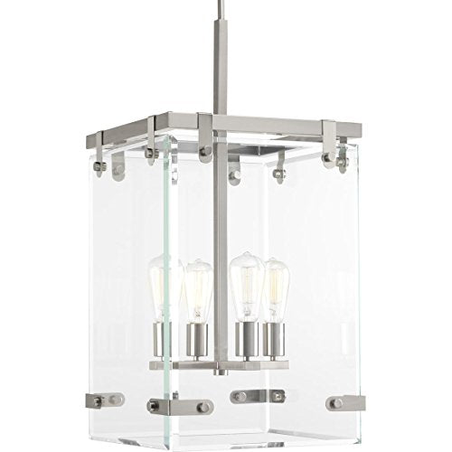 Inspired by modern architecture. Glayse features handsome details for variety of interior design styles. The frameless unbounded beveled glass creates beautiful light and reflection. The structure of Glayse is the focal point of the design, where form follows function. The four-light pendant is complimented by a Brushed Nickel finish.