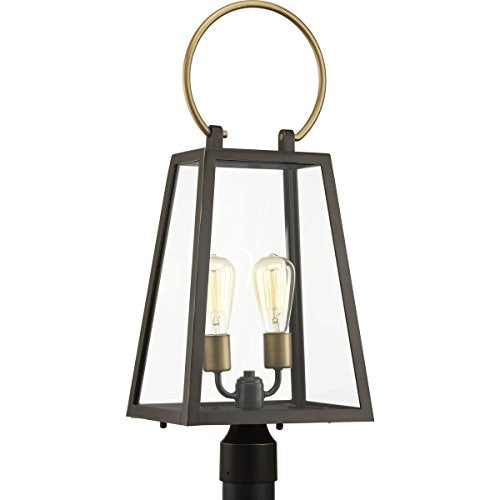 Barnett lanterns deliver timeless appeal with a decidedly modern flair. Large clear panes of glass frame your choice of traditional or vintage style bulbs. A graphic-inspired overscaled loop features a contrasting brass-tone finish. Two-Light Post Lantern.