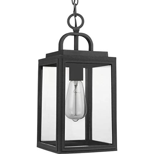 This hanging lantern partners timeless elegance with a pinch of coastal vibe. A beautiful black square frame crafted from corrosion-proof composite polymermaterial features a half loop on top of its structure. The frame holds clear glass panes in place for a look sure to complement other farmhouse and coastal decor. DURASHIELD by Progress Lighting is built to last. Constructed from a composite material with UV protection, DURASHIELD holds up even in the harshest weather conditions. This high-performance finish has a 5-year warranty and is resistant to rust, corrosion, and fading.