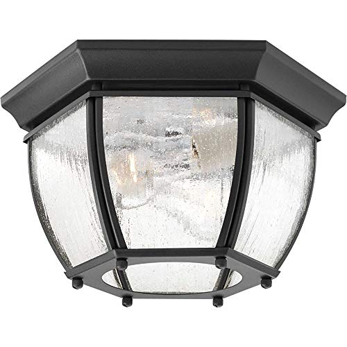Solid two-light flush mount in rich weathered finish is complemented by seeded glass panels - a great choice for low maintenance and years of enjoyment. Black finish.